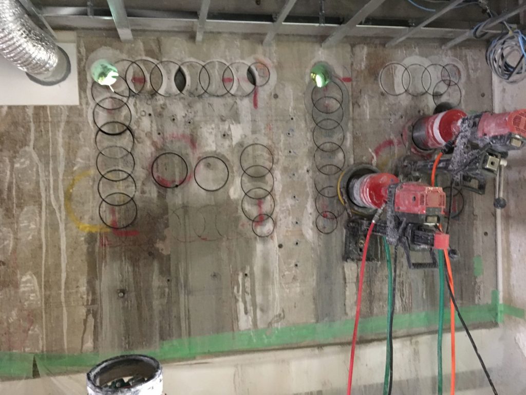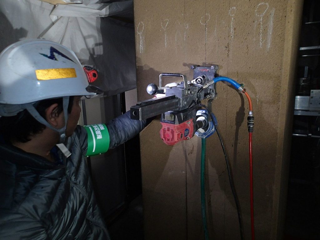 コアドリリング工事 CORE DRILLING WORK コアドリリング工法 円形のダイヤモンドコアビットを使って、コンクリートの壁や床、構造物に穴を開けることをコア抜きと言います。コアボーリング、コア削孔、コア穿孔とも言います。弊社のようにコア抜きを行う業者は、建設現場では「コア屋さん」と呼ばれています。 特徴切れないものは無い地球上一番固い、ダイヤモンドビットを使った穿孔なので、あらゆる材質も切断できます。小口径から大口径まで小さいものは27φから大きいものは600φまでのダイヤモンドビットがあり、用途に合わせた大きさに穿孔できます。耳障りな音が少ない低騒音その他ドリルと比較して、音が小さく騒音が少ない事も特徴です。また、耳障りな高音域の音がカットされています。粉じんが少ない給水ポンプから水に圧をかけ水の供給を行って穿孔するため、粉じんが少なく環境に配慮することができます。(乾式ダイヤモンドビットを使用する場合もあります。)狭い場所でも施工できる機械が小型であるため、狭い橋梁の際でも施工する事ができます。